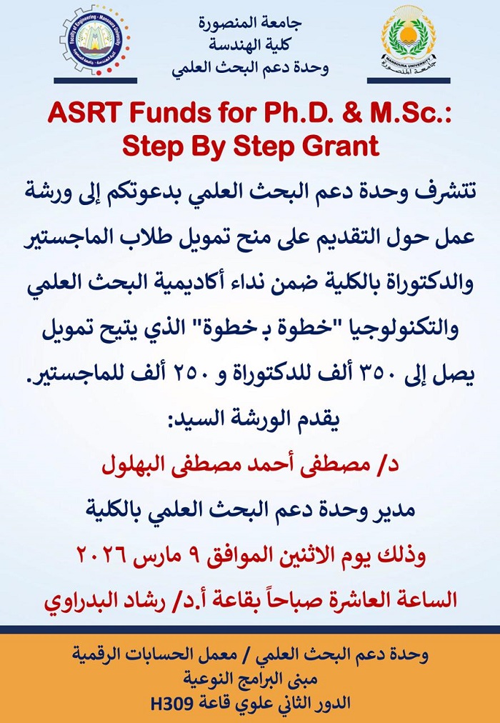 نظّمت وحدة دعم البحث العلمي بالكلية ورشة عمل عن التقديم على منحة خطوة بـ خطوة المقدمة من أكاديمية البحث العلمي والتكنولوجيا، وذلك للتعريف بآليات التقديم على برنامج دعم تمويل رسائل الماجستير والدكتوراة الذي تقدمه الأكاديمية.