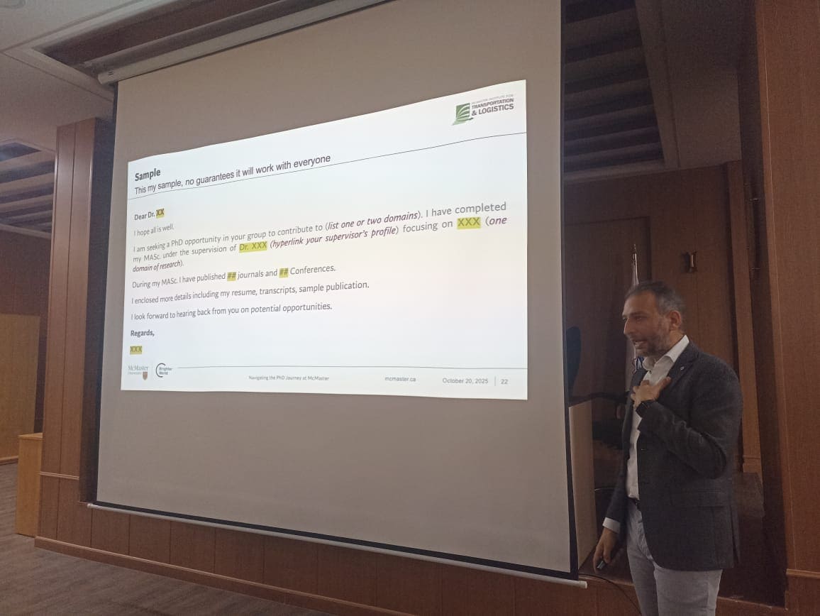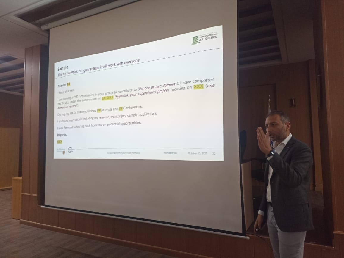 تحت رعايه السيد ا. د. شريف خاطر رئيس جامعة المنصورة والسيد ا. د. طارق غلوش نائب رئيس الجامعه للدراسات العليا والبحوث و ا. د. شريف مسعود البدوي عميد كلية الهندسة، وتنسيق الدكتور/ أسامة الراوي شهدة، الأستاذ المساعد بقسم هندسة الأشغال العامة ومنسق الاتفاقية، قام السيد الدكتور/ معتز محمد، ممثل جامعة ماكمستر بدولة كندا، الأستاذ المساعد بقسم الهندسة المدنية ومدير معهد ماكمستر للنقل والخدمات اللوجستية (MITL) فى ختام زيارته لجامعة المنصورة، ، بإلقاء محاضرتين بمدرج الدكتور رشاد البدراوى بكلية الهندسة،وكانت المحاضرة الاولى بعنوان: رحلة الدكتوراه في جامعة ماكمستر: من الحوار الأول إلى المناقشة النهائية، والمحاضرة الثانية بعنوان: العلاقة بين الطاقة والتنقل والبيئة: تأملات في عقد من الأبحاث التطبيقية.