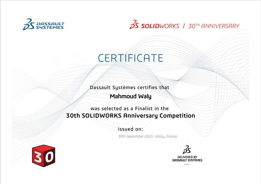 تتقدم كلية الهندسة – جامعة المنصورة بخالص التهنئة لأبنائها الطلاب لاختيار 7 طلاب من الكلية ضمن أفضل المصممين باستخدام برنامج SOLIDWORKS على مستوى العالم، وذلك في إطار احتفالية مرور 30 عامًا على إنشاء البرنامج، في إنجاز عالمي يعكس تميز طلاب الكلية وقدرتهم على المنافسة الدولية في مجال التصميم الهندسي ثلاثي الأبعاد.