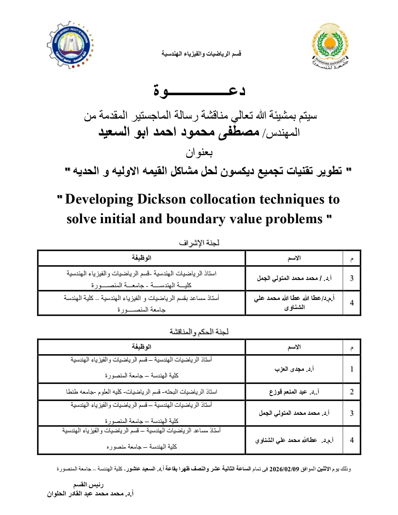 يعلن قسم الرياضيات والفيزياء الهندسية كلية الهندسة جامعة المنصورة عن حاجته لمهندسين للعمل بالساعة لتدريس مقررات رياضيات هندسية وذلك للعام الجامعي 2025-2026 على أن يكون حاصل على بكالوريوس هندسة بتقدير لا يقل عن جيد جدا ويفضل الحاصلين على درجة الماجستير ومن له خبرة تدريسية.