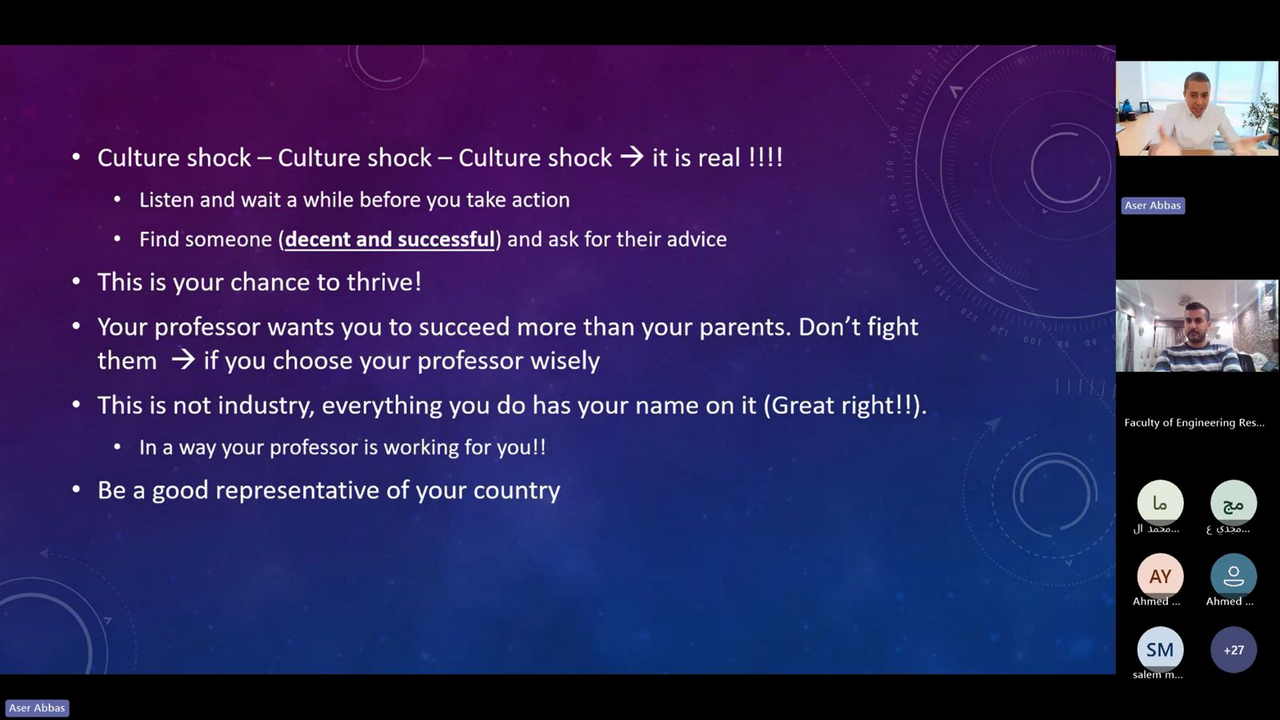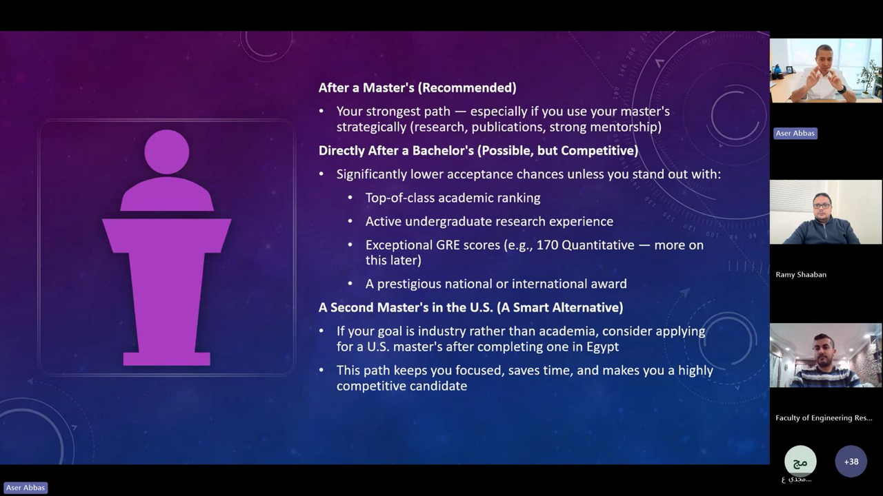 في إطار دعمها المستمر لطلاب الدراسات العليا والباحثين، نظمت وحدة دعم البحث العلمي بكلية الهندسة محاضرة متخصصة بعنوان "التقديم لمنح الماجستير والدكتوراه في الولايات المتحدة الأمريكية"، وذلك يوم الاثنين الموافق 16 فبراير 2026 في تمام الساعة السابعة مساءً، بحضور 65 من المهتمين من منتسبي الكلية.