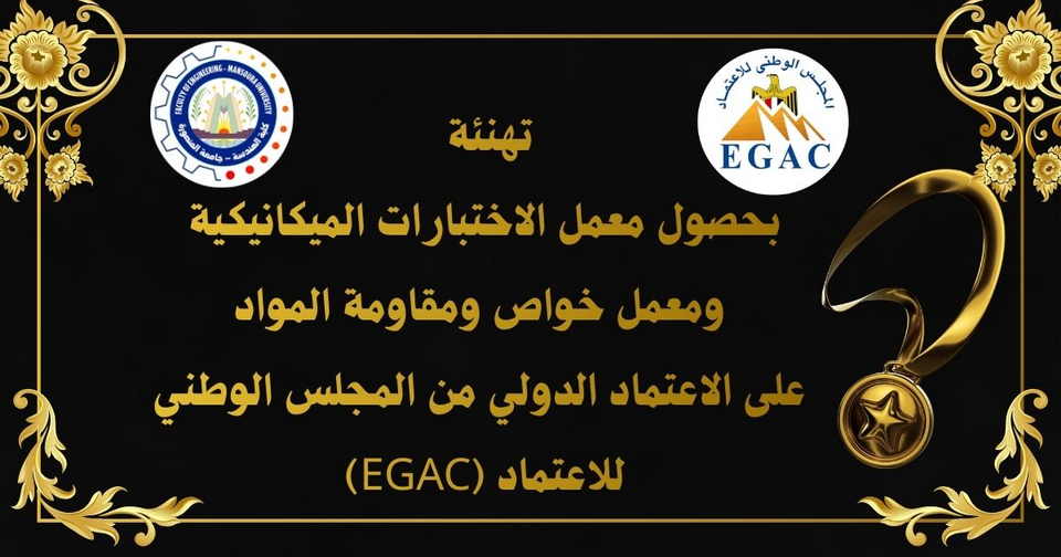 يتقدم السيد الأستاذ الدكتور شريف مسعود البدوي عميد الكلية، والسادة وكلاء الكلية، وجميع منسوبي كلية الهندسة بخالص التهنئة والتقدير إلى فريق العمل بـمعمل الاختبارات الميكانيكية ومعمل خواص ومقاومة المواد، بمناسبة حصولهما على الاعتماد الدولي من المجلس الوطني للاعتماد (EGAC)، طبقًا لمتطلبات المواصفة الدولية ISO/IEC 17025:2017، وذلك في إنجاز جديد يُضاف إلى سجل الكلية الحافل بالتميّز حيث يصبح عدد المعامل المعتمدة بالكلية أربعة معامل و هم ( معمل هندسة الطرق و المطارات – معمل ميكانيكا التربة و الأساسات – معمل الإختبارات الميكانيكية – و معمل خواص و مقاومة المواد).