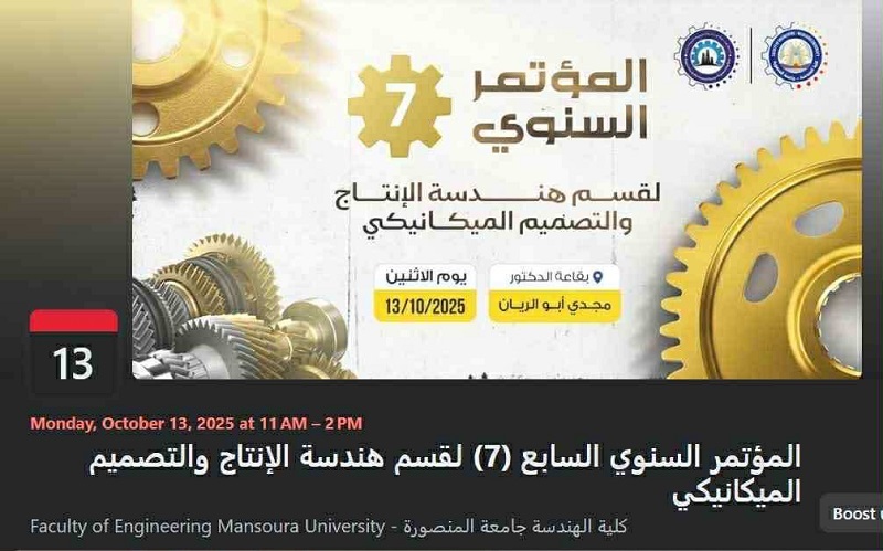 دعوة لحضور المؤتمر السنوي السابع لقسم هندسة الانتاج والتصميم الميكانيكي بقاعة الاستاذ الدكتور مجدي ابو ريان يوم الاثنين الموافق ١٣/١٠/٢٠٢٥ وذلك في تمام الساعة ١١ صباحًا حتى الساعة الثانية ظهرًا.
