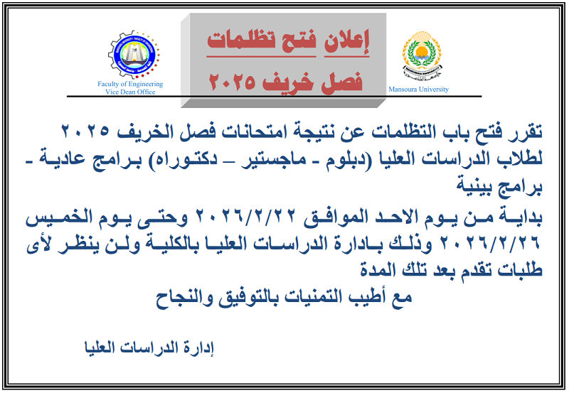 تعلن إدارة التربية العسكرية بجامعة المنصورة عن إقامة دورة للتربية العسكرية خلال الفترة من 23/02/2026 حتى 9/03/2026
