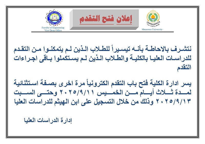 إعلان هام : تم مد التقدم للدراسات العليا من 11/9/2025 وحتى 13/9/2025