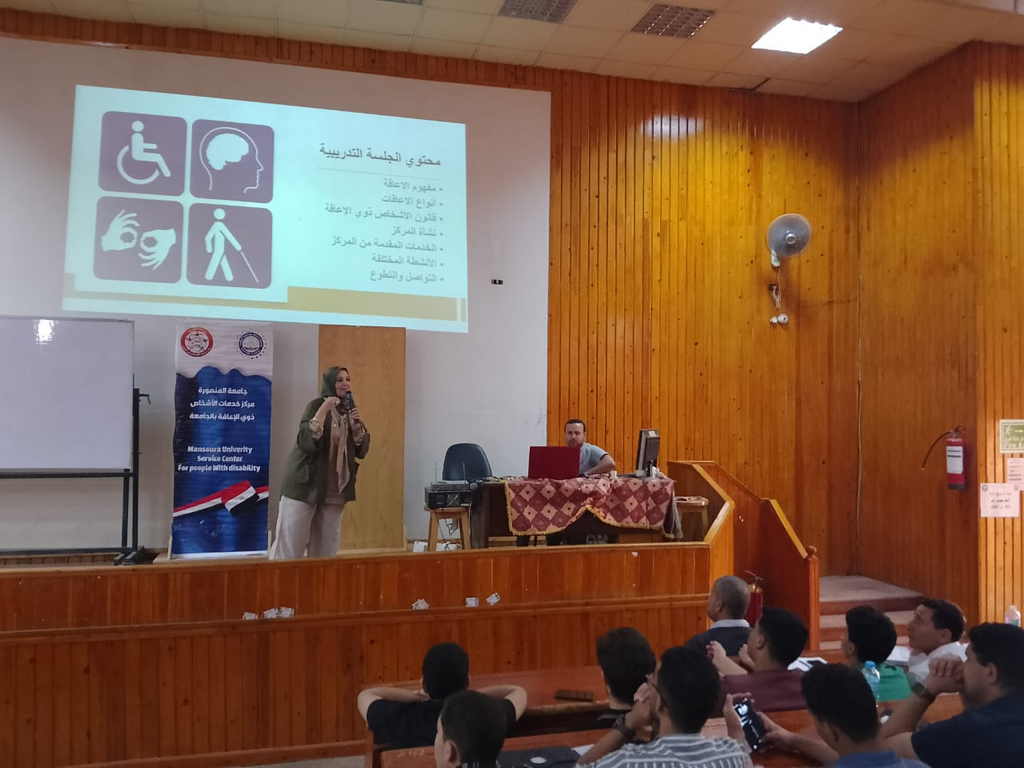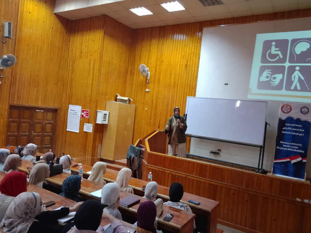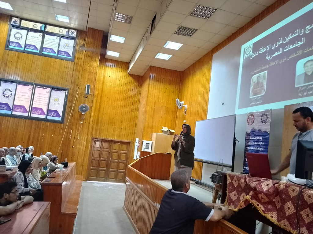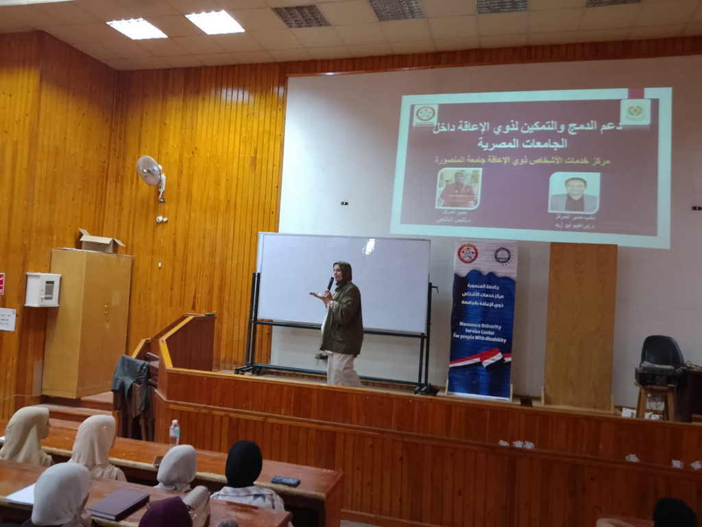 وقد ألقت المحاضرة الدكتورة نانيس صلاح البلتاجي – مدير مركز خدمات الأشخاص ذوي الاحتياجات الخاصة، وشاركها في العرض الدكتور عبد الحميد رجب أبو الأسعاد – منسق خدمات ذوي الاحتياجات الخاصة بكلية الهندسة.