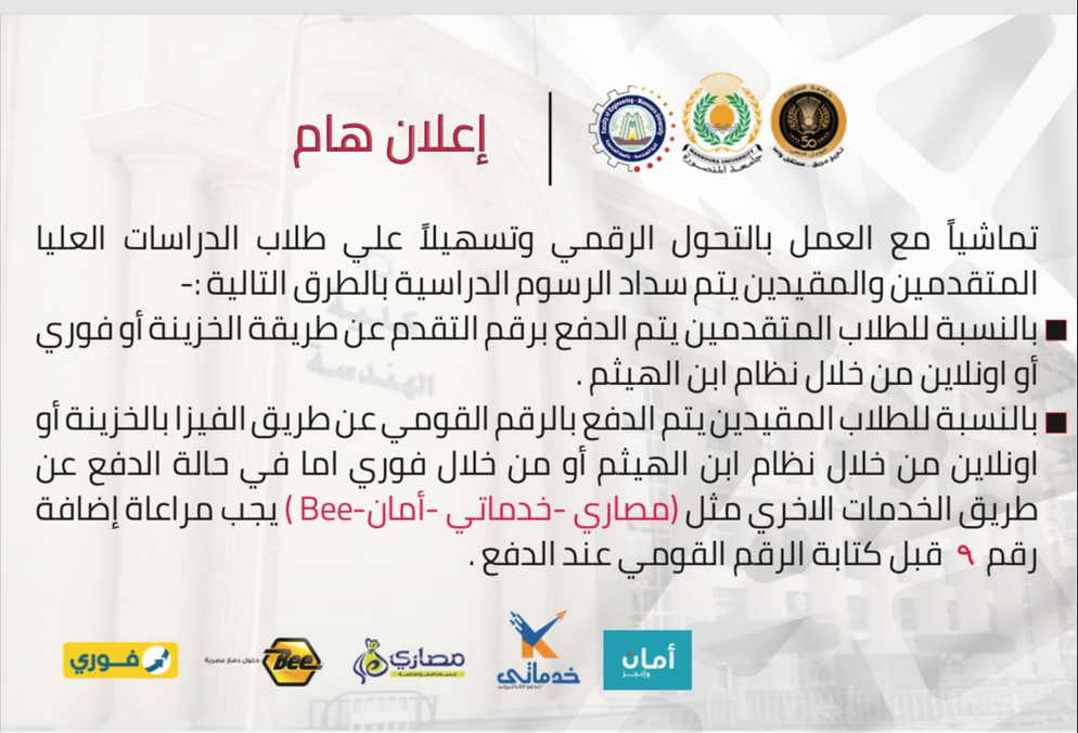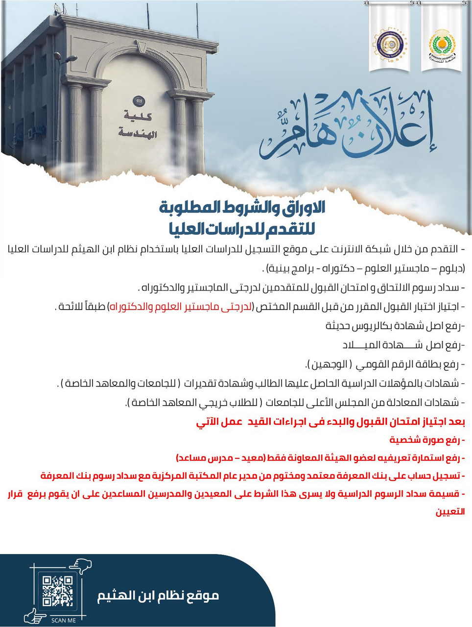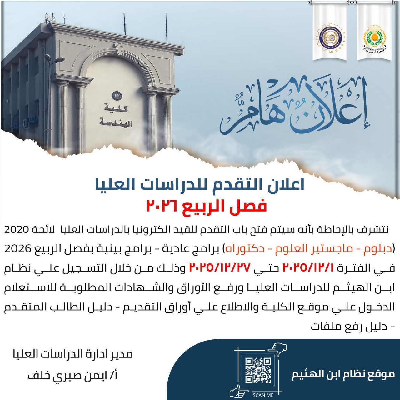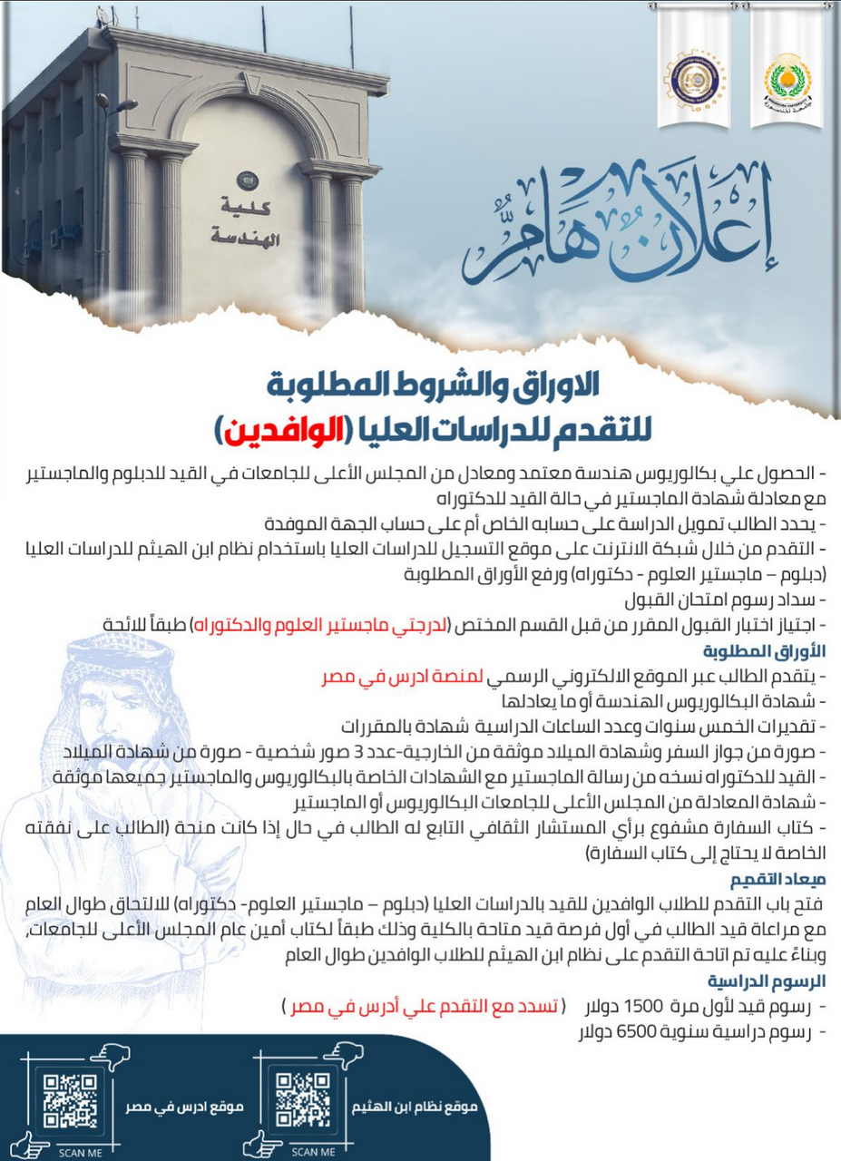 نتشرف بالإحاطة بأنه سيتم فتح باب التقدم للقيد الكترونيا بالدراسات العليا لائحة 2020 (دبلوم - ماجستير العلوم - دكتوراه) برامج عادية - برامج بينية بفصل الربيع 2026 في الفترة ٢٠٢٥/١٢/١٤ حتي ٢٠٢٥/١٢/٢٧ وذلك من خلال التسجيل علي نظام ابن الهيثم للدراسات العليا ورفع الأوراق والشهادات المطلوبة للاستعلام الدخول علي موقع الكلية والاطلاع علي أوراق التقديم - دليل الطالب المتقدم - دليل رفع ملفات